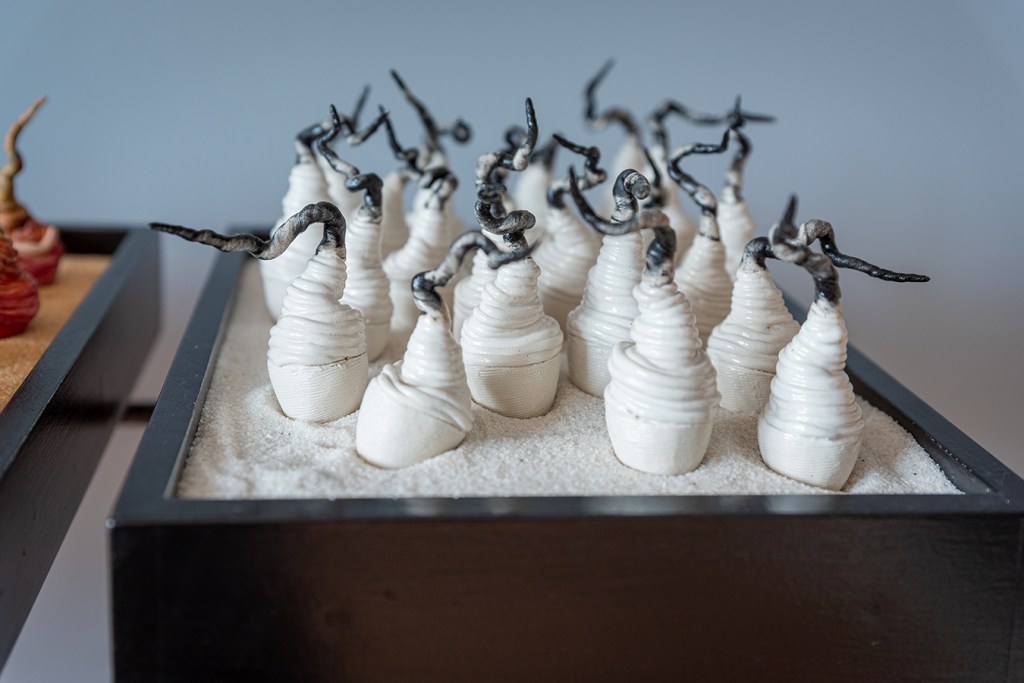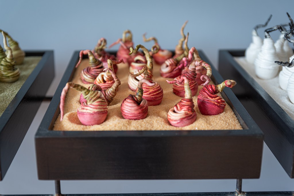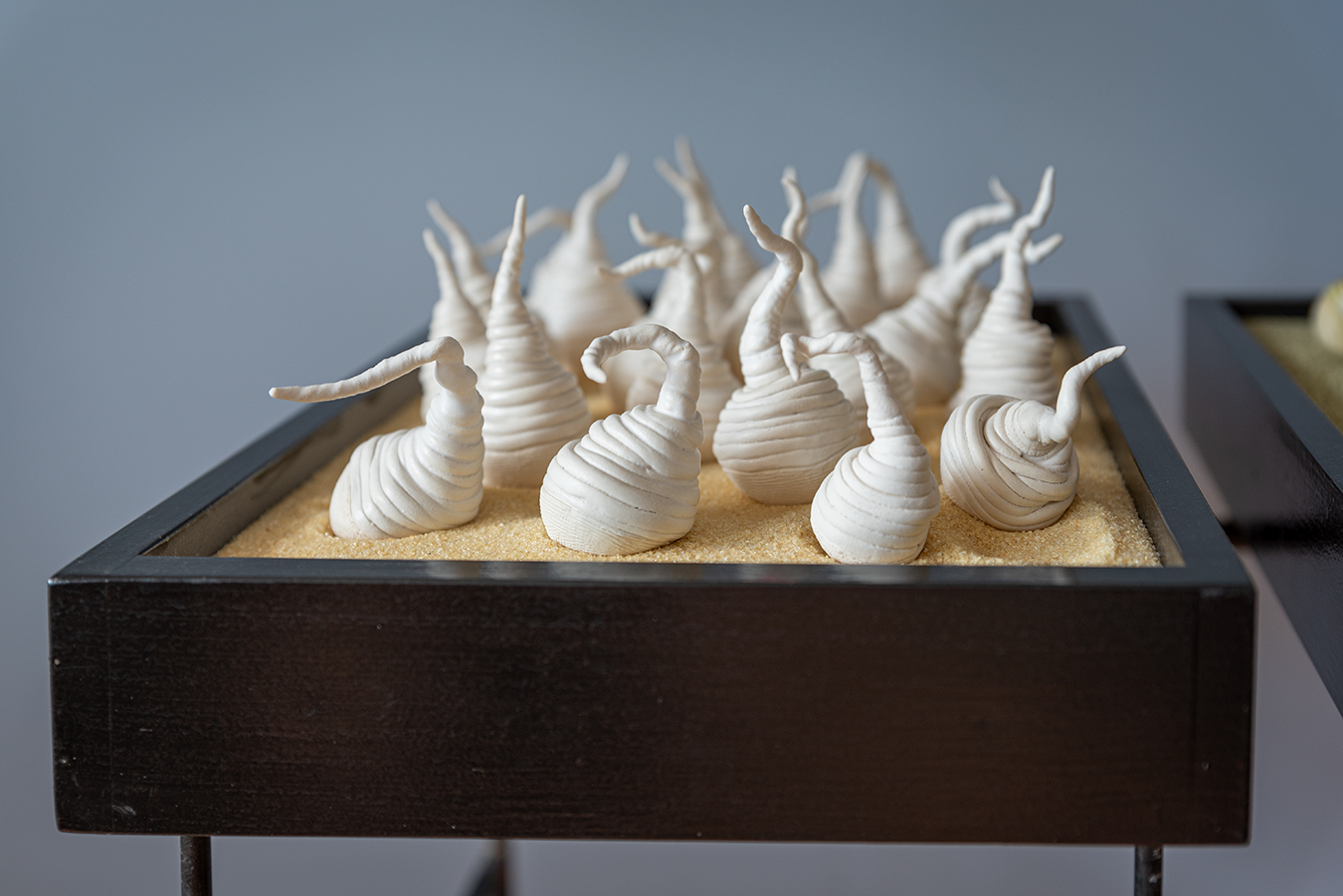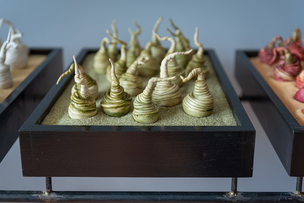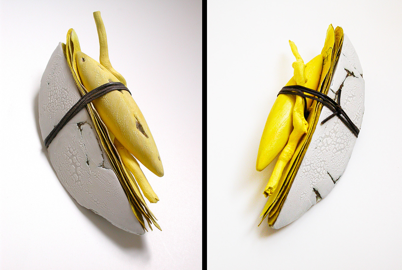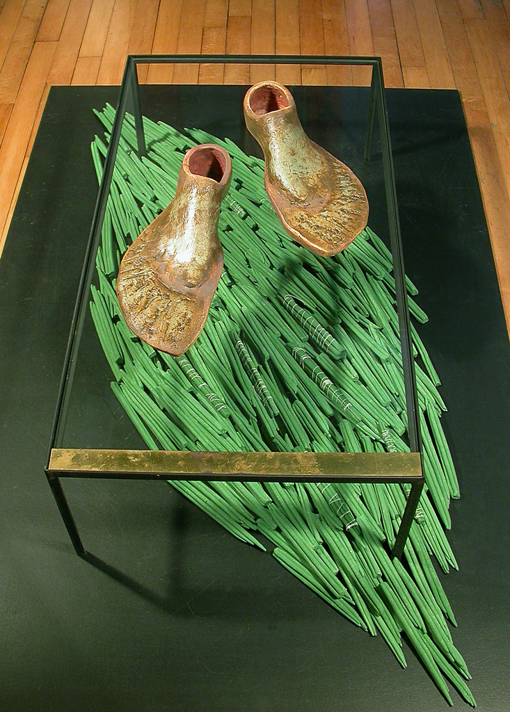 « Marie-Andrée Côté inspirée de la nature, crée des installations/sculptures en céramique. Incorporant des formes naturelles (cosses, graines, racines, etc.) dans ses créations, elles symbolisent la fertilité. » Karl-Gilbert Murray » – PasséPrésent – l’objet d’art sans frontière » Musée d’Art contemporain des Laurentides -1999