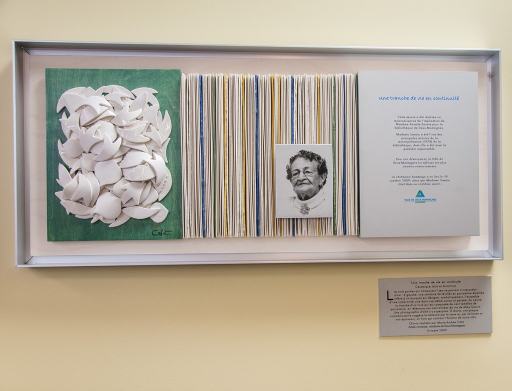 « Une tranche de vie en continuité » Oeuvre public soulignant le 100e anniversaire de Mme Savoie – « Annette Savoie est la première responsable de la bibliothèque municipale de Deux–Montagnes » céramique, bois. aluminium – – Deux-Montagnes -2009
