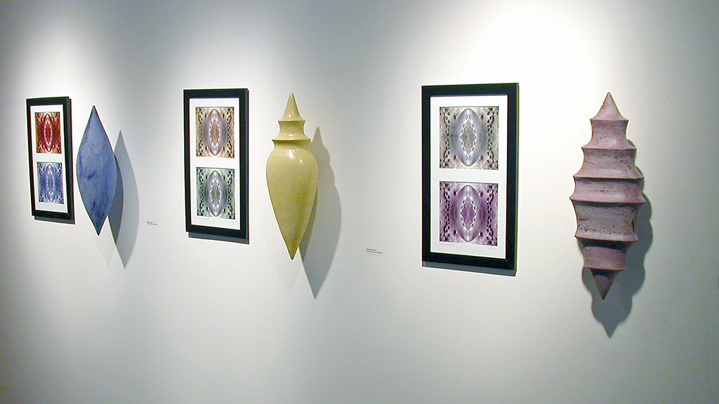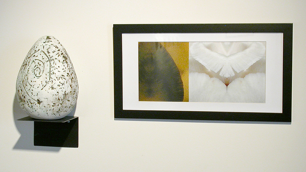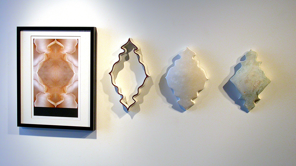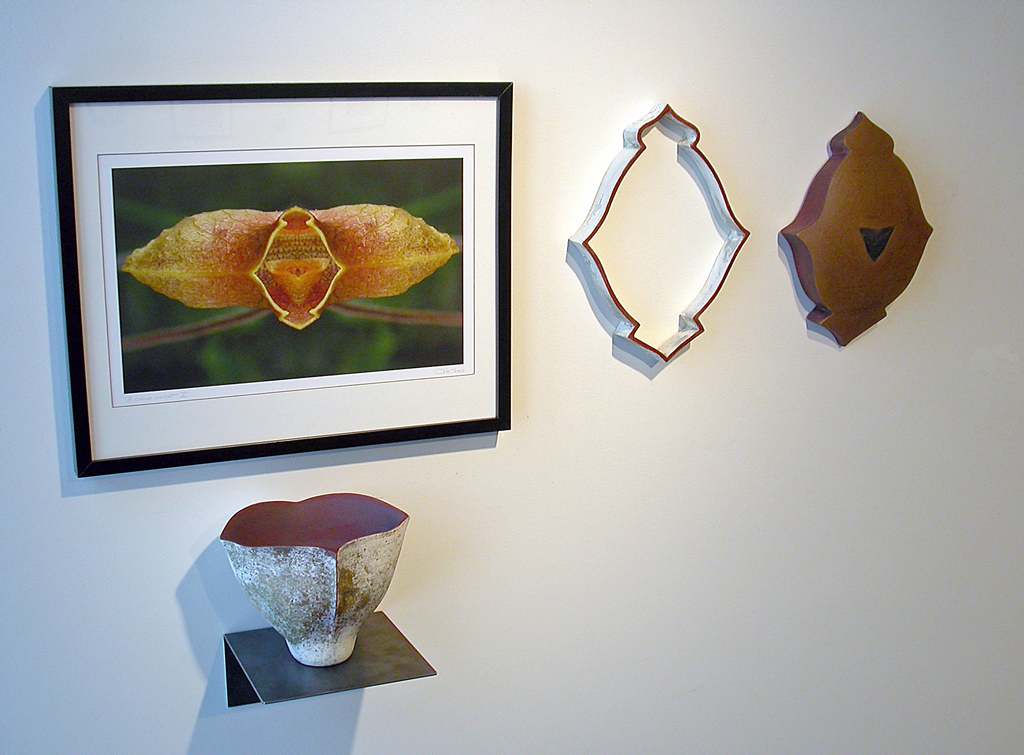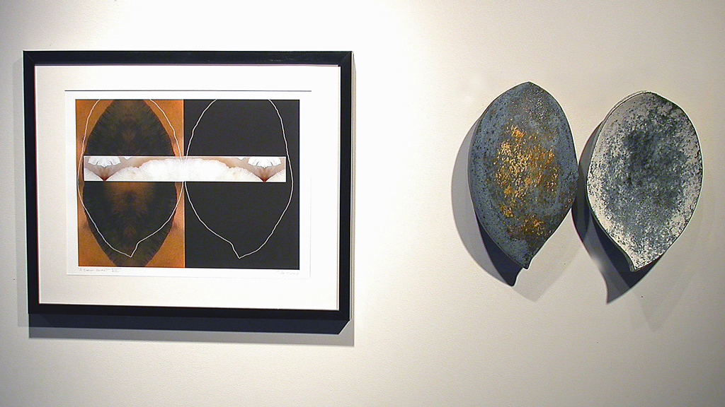 « Depuis plusieurs années la nature est une source d’inspiration privilégiée pour l’artiste. Des expositions comme Sementia, (2003;2002;2001), De terre à terre (2001), Nature Fragmentée (1999) en témoignent. Cette nouvelle exposition À cœur ouvert est le prolongement de cette même source d’inspiration où plus que jamais les mouvements de la nature sont explorés voire érotisés. Les graines de semence, la fécondité, la germination, les processus de croissance de la vie stimulent et nourrissent l’imagination de l’artiste. Dans un premier temps, l’artiste capture cette nature par la photographie. Prises intuitivement ces photos sont son dessin d’observation qu’elle rassemble alors dans un carnet (dans un sketch-book) pour ensuite, à l’aide du logiciel Photoshop, les recomposer, les coloriser, les transformer, les réinterpréter, les multiplier jusqu’à leur donner un nouveau sens et créer ainsi une oeuvre indépendante. … Chaque pièce de cette série est accompagnée d’une céramique qui reprend dans les mêmes tons avec des glaçures craquelées et écaillées la forme au cœur de l’image. Côte à côte ces céramiques forment un langage codé, secret, mystérieux. »