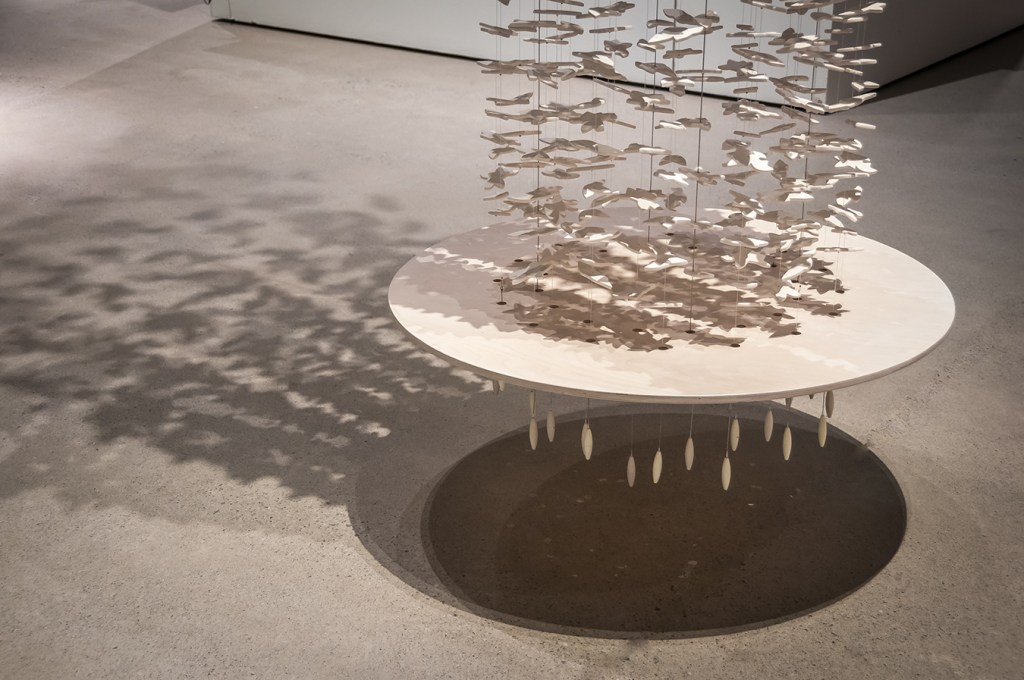 Marie-Andrée Côté travaille également le concept de biodiversité, elle se penche sur les multiples formes de feuilles, racines, graines jusqu’à leurs composantes microscopiques. Elle travaille beaucoup en forme de tondo, organisant de petites pièces de porcelaine en motifs de spirales, qui rappellent des micros-organismes, des pétales de fleurs ou le vent qui joue sur l’eau. « En équilibre entre terre et ciel » est un assemblage de milliers d’éléments de porcelaine en forme de feuilles suspendues pour former une colonne semblable à un arbre. Un cercle de contre plaqué percé de trous en forme la base. Les fils retenant les porcelaines passent par les trous pour rejoindre des plombs qui représentent la sève, la force vitale de l’arbre. Côté s’inspire de la régénération naturelle comme méthode de construction: elle relie les pièces , une par une, pour créer des structures complexes. En choisissant la porcelaine, matière tirée de la terre, elle honore la beauté et la complexité du monde naturel. En combinant un nombre infini de pièces minuscules pour en faire de grands organismes, elle crée des énoncés émouvants sur la fragilité et l’interdépendance de tous les vivants.