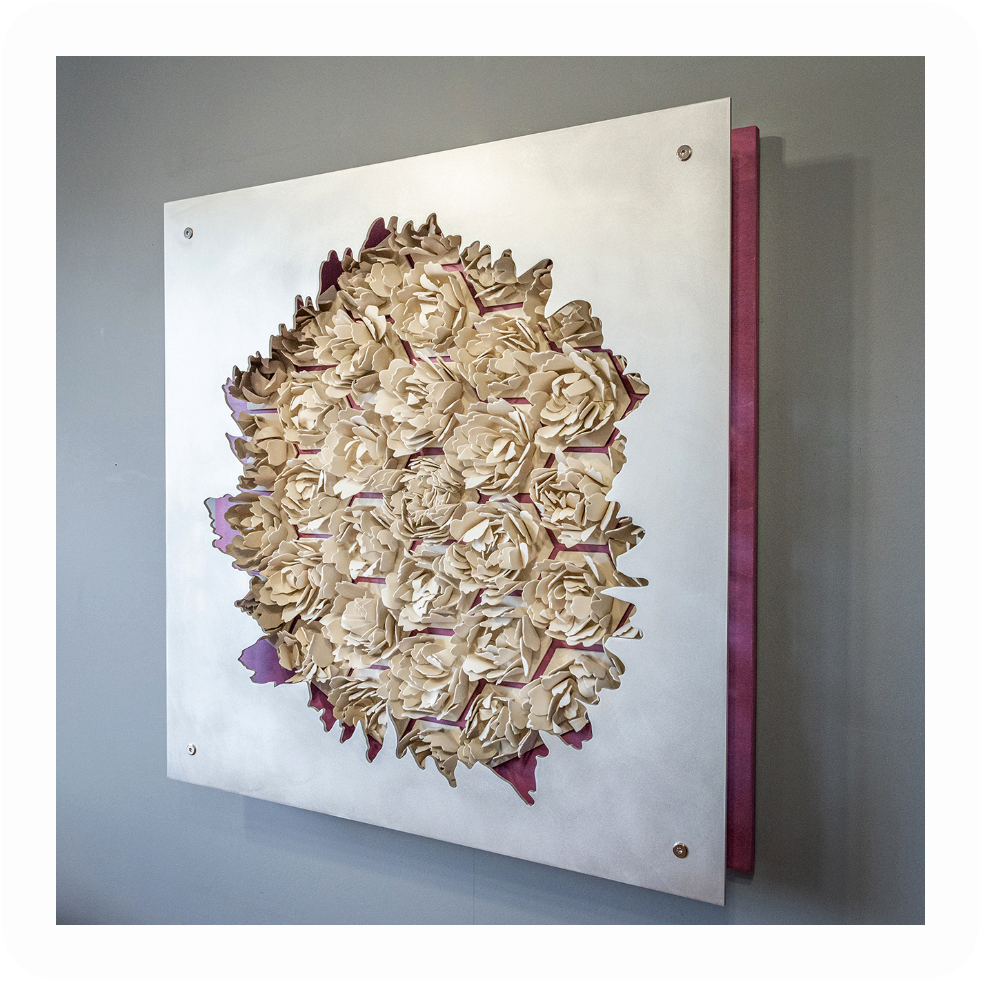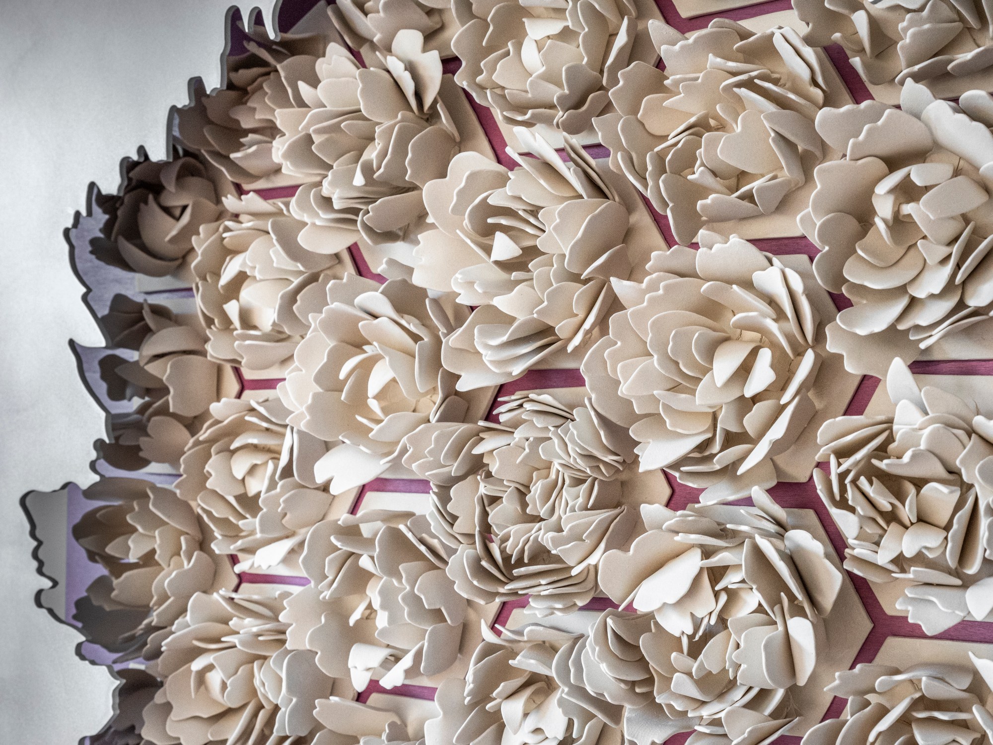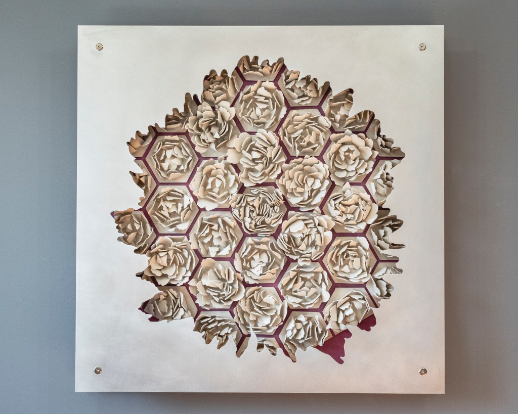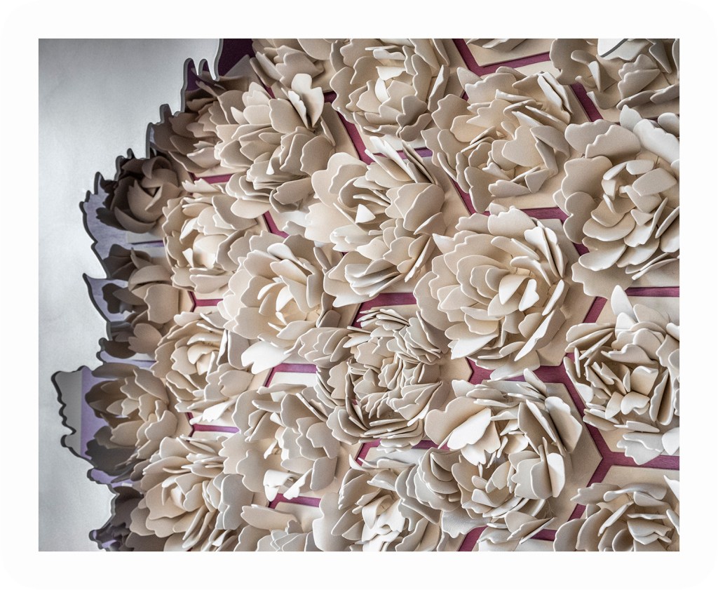In the work that I propose, a distancing is characterized by the cutting of aluminum flower silhouette that is superimposed on a hexagon of ceramic flower petals. The hexagonal shape is a reminder of honeycombs built by bees to store honey. This work speaks of limits, gestures, and responsibilities, which constitute the sole bulwark against the degradation of our natural environments.