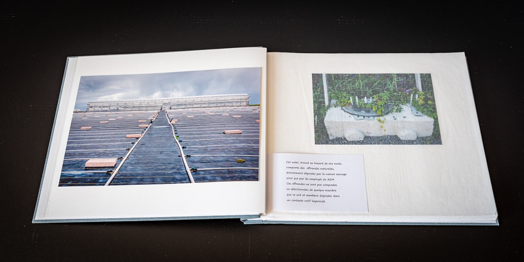 Cet autel, trouvé au hasard de ma route, comporte des offrandes naturelles, directement déposées par la nature sauvage ainsi que par les employés du REM. Ces offrandes ne sont pas composées ou sélectionnées de quelques manières que ce soit et semblent disposées dans un contexte votif improvisé.