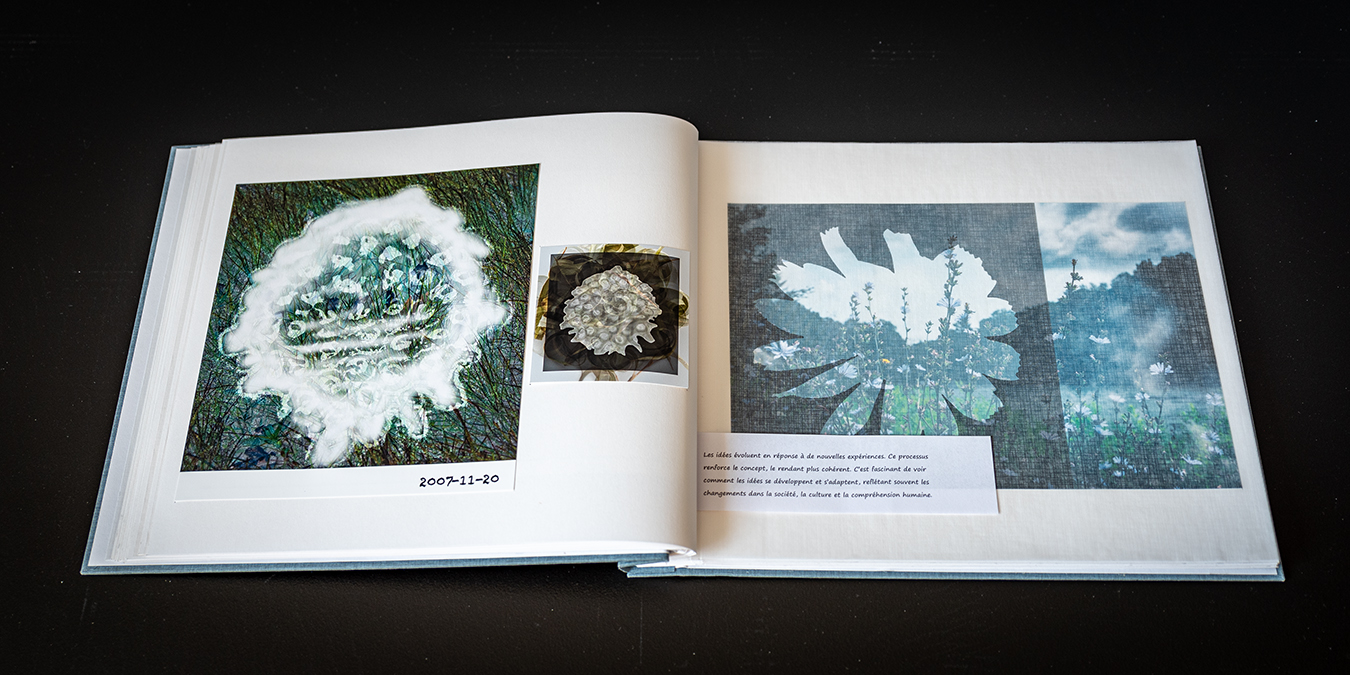 Le journal de bord documente et partage mon parcours de recherche. En combinant des photos, des dessins et des réflexions personnelles, j’ai créé un récit visuel et textuel qui capture l’évolution de mon travail et de ma pensée. Cela enrichit ma compréhension de mon travail et permet aussi au public de mieux appréhender les cheminements intellectuels et émotionnels qui ont guidé ma démarche. Lors de l’exposition, ce journal offre un point d’entrée intime et personnel pour les visiteurs, leur permettant de se connecter à mon travail d’une manière plus personnelle.